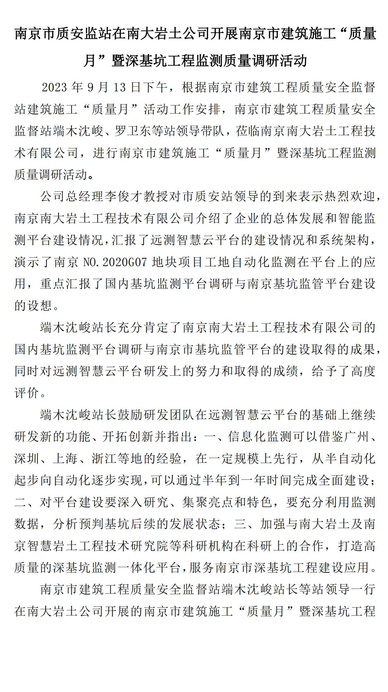 南京市建筑施工“質(zhì)量月”暨深基坑工程監(jiān)測質(zhì)量調(diào)研活動(dòng)